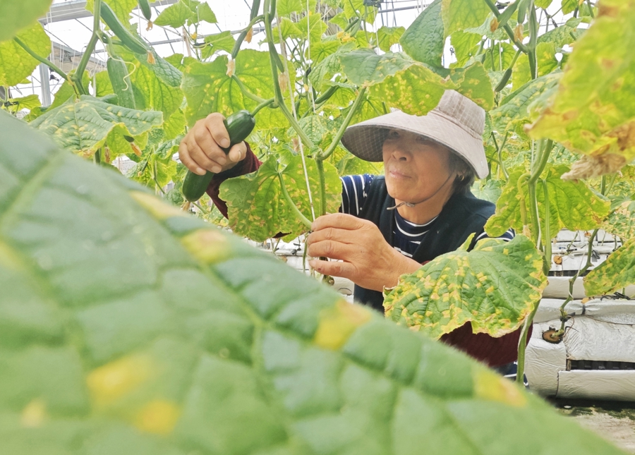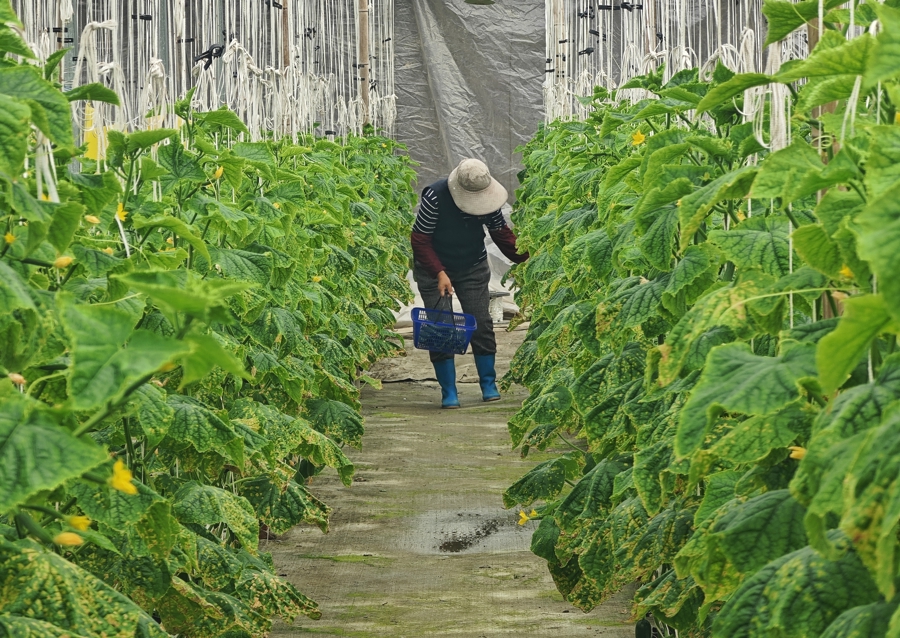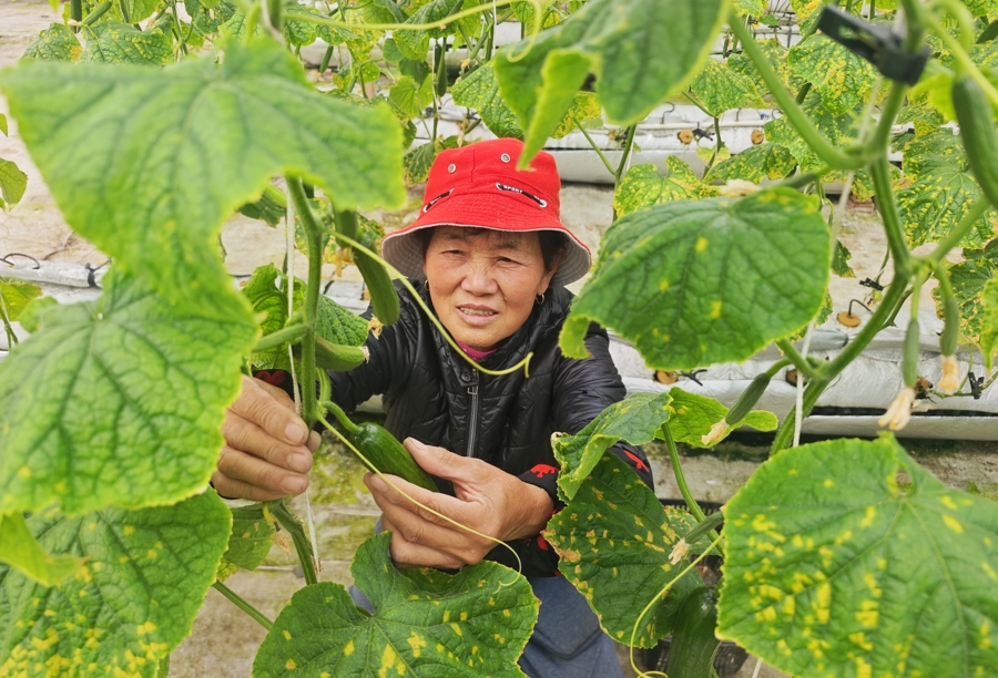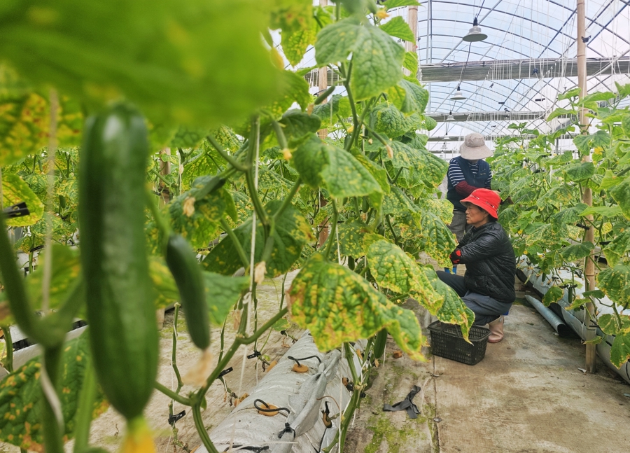 在金山区金山卫镇的上海农瑞生态农业发展有限公司的种植大棚里,翠绿多汁的水果黄瓜迎来丰收,12月10日上午,果农正在采摘上市。